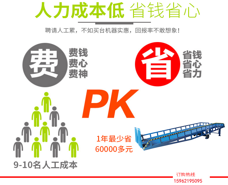 采用人工液壓動力,勿須外接動力電源即可輕松實現(xiàn)登車橋的高度調節(jié)。