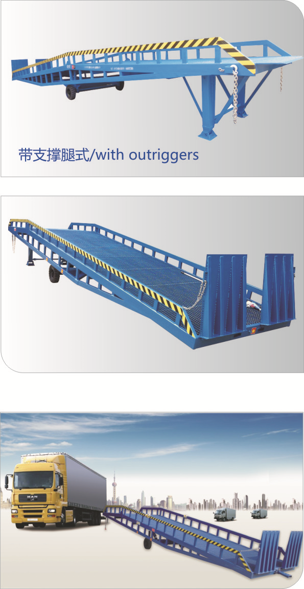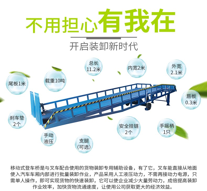 移動液壓登車橋是與叉車配合使用的貨物裝卸專用輔助設備,有了它,叉車能直接從地面進入汽車車廂內(nèi)進行裝卸貨物的作業(yè)。能夠提高貨物裝卸速度,節(jié)省裝卸工作的時間以及人力,是您裝卸貨物的得力助手。只需單人操作,不需動力電源,即可實現(xiàn)貨物的安全快速裝卸。移動式登車橋用于無裝卸設備的貨臺及流動裝卸場所,是與叉車配合使用的貨物裝卸輔助設備??筛鶕?jù)汽車車廂的高低調節(jié)高度,叉車可以直接通過本設備駛入車廂內(nèi)部進行貨物的批量裝裝卸。